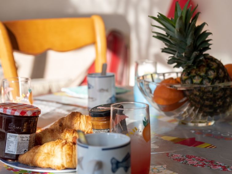 Halfvrijstaand huis 4-kamers 77 m2 op 2 verdiepingen. Woon-/eetkamer met TV (Flatscreen TV), radio. Uitgang naar het terras. Keuken (4-pits kookplaat, oven, afwasmachine, magnetron, diepvriezer). Aparte WC. Bovenverdieping: 2 kamers, elke kamer heeft 1 2-pers bed (140 cm). 1 kamer met 1 bed (100 cm). Douche, aparte WC. Gas-verwarming. Klein terras 10 m2, zithoek in de tuin. Terrasmeubelen, ligstoelen (2). Ter beschikking: wasmachine, droger. Internet (WiFi, extra). Parkeerplaats nr. 7. TV alleen FR. Rookmelders. 56186 000415 M3