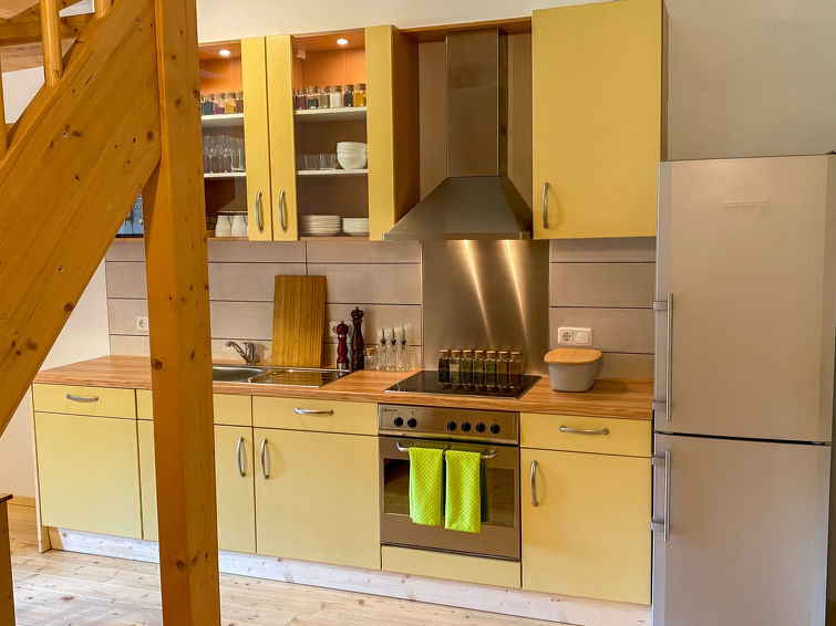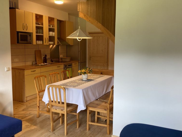 "Hasenstall / Top 8", appartement 5-kamers 79 m2 op 2 verdiepingen op de 2e verdieping. Het objekt is geschikt voor 8 volwassenen + 1 kinderen. Gedeeltelijk afgeschuinde daken, volledig gerenoveerd in 2023, zeer smaakvol en met veel hout ingericht: hal. Groot, open woon-/eetkamer. 1 2-pers. kamer met 1 2-pers divanbed. 1 2-pers. kamer met 1 x 2 stapelbedden. Open keuken (oven, afwasmachine, broodrooster, waterkoker, elektrische koffiemachine). 2 bad/douche/WC's. Bovenverdieping: 1 2-pers. kamer met 1 2-pers bed. 1 2-pers. kamer met 2 bedden. Parketvloeren. Klein balkon 6 m2. Zeer mooi panoramazicht op de bergen. Ter beschikking: wasmachine, strijkijzer. Internet (Internet (WiFi), gratis). Geschikt voor families. Privé ingang, rookmelders, brandblusser, geen lift.
