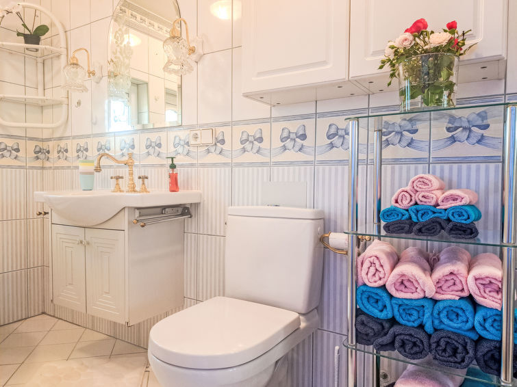 "Rose", villa 5-kamers 130 m2. Smaakvol en romantisch ingericht: hal. Woonkamer. 1 2-pers. kamer. Bad/WC, Sauna. Bovenverdieping: woon-/eetkamer met 1 2-pers divanbed, eethoek en Kabel-TV. Uitgang naar het balkon. 1 2-pers. kamer. Kleine keuken (oven, afwasmachine, 4 keramische glas kookplaten, broodrooster, waterkoker, elektrische koffiemachine). Bad/WC met hoekbad. 2e Verdieping: 1 2-pers. kamer. Klein terras, kleine tuin. Terrasmeubelen. Zeer mooi uitzicht op het meer. Ter beschikking: wasmachine, droger, sauna.