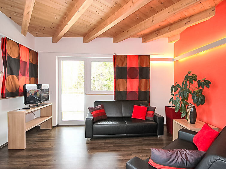 "Top 4", appartement 2-kamers 54 m2 op de 1e verdieping. Ruim, zeer comfortabel en smaakvol ingericht: hal. 1 2-pers. kamer. Woonkamer met Sat-TV (Flatscreen TV). Uitgang naar het balkon, naar het terras. Open keuken (oven, afwasmachine, 4 keramische glas kookplaten, elektrische koffiemachine, pads voor de koffiemachine (Cafissimo) extra) met eettafel. Douche/WC, Sauna. Vloerverwarming. Groot balkon, terras 28 m2, op het zuidoosten gelegen en op het noordoosten gelegen. Balkonmeubilair, ligstoelen. Mooi uitzicht op de bergen. Ter beschikking: haardroger. Internet (WiFi, gratis). Niet rokers woning. Maximaal 1 huisdier/hond toegestaan. Rookmelders.