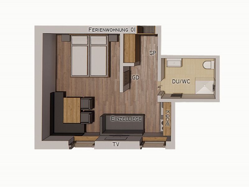 "Studio 1", appartement 1-kamer 25 m2, op de begane grond. Comfortabel en smaakvol ingericht: hal. 1 2-pers. kamer. Kookhoek (afwasmachine, 1 inductiekookplaten, waterkoker, magnetron, elektrische koffiemachine, pads voor de koffiemachine (Erstausstattung)) met 1 bed, eethoek en Sat-TV (Flatscreen TV). Douche/WC. Verwarming. Houten vloeren. Parkeerplaats (1 Auto). Woning aan de straatzijde. Niet rokers woning. Maximaal 1 huisdier/hond toegestaan.